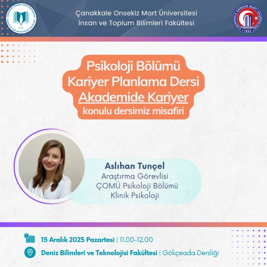 Çanakkale Onsekiz Mart Üniversitesi Psikoloji Bölümü, Klinik Psikoloji A.B.D. Araştırma Görevlisi Aslıhan TUNÇEL 15 Aralık 2025 Pazartesi günü Psikoloji Bölümümüzde, 1. sınıf öğrencilerimizin almakta olduğu Kariyer Planlama dersi kapsamında “Akademide Kariyer” başlıklı 14. hafta dersine konuk oldu.